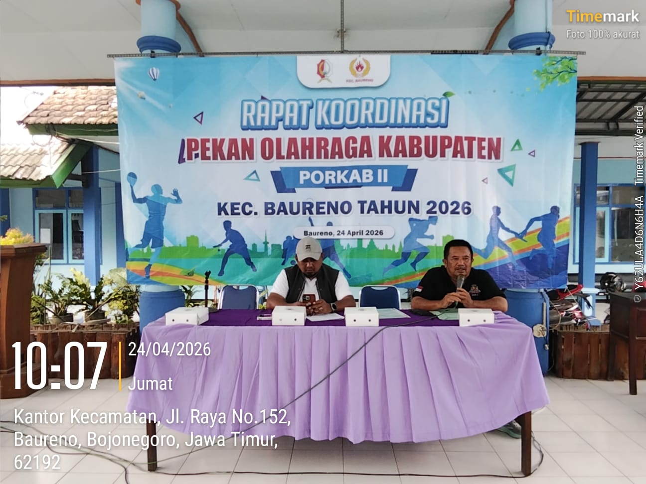 Baureno – Rapat Koordinasi Pekan Olahraga Kabupaten (PORKAB) II dilaksanakan pada Jum’at, 24 April 2026, bertempat di Pendopo Kecamatan Baureno. Kegiatan ini dimulai pukul 10.00...
